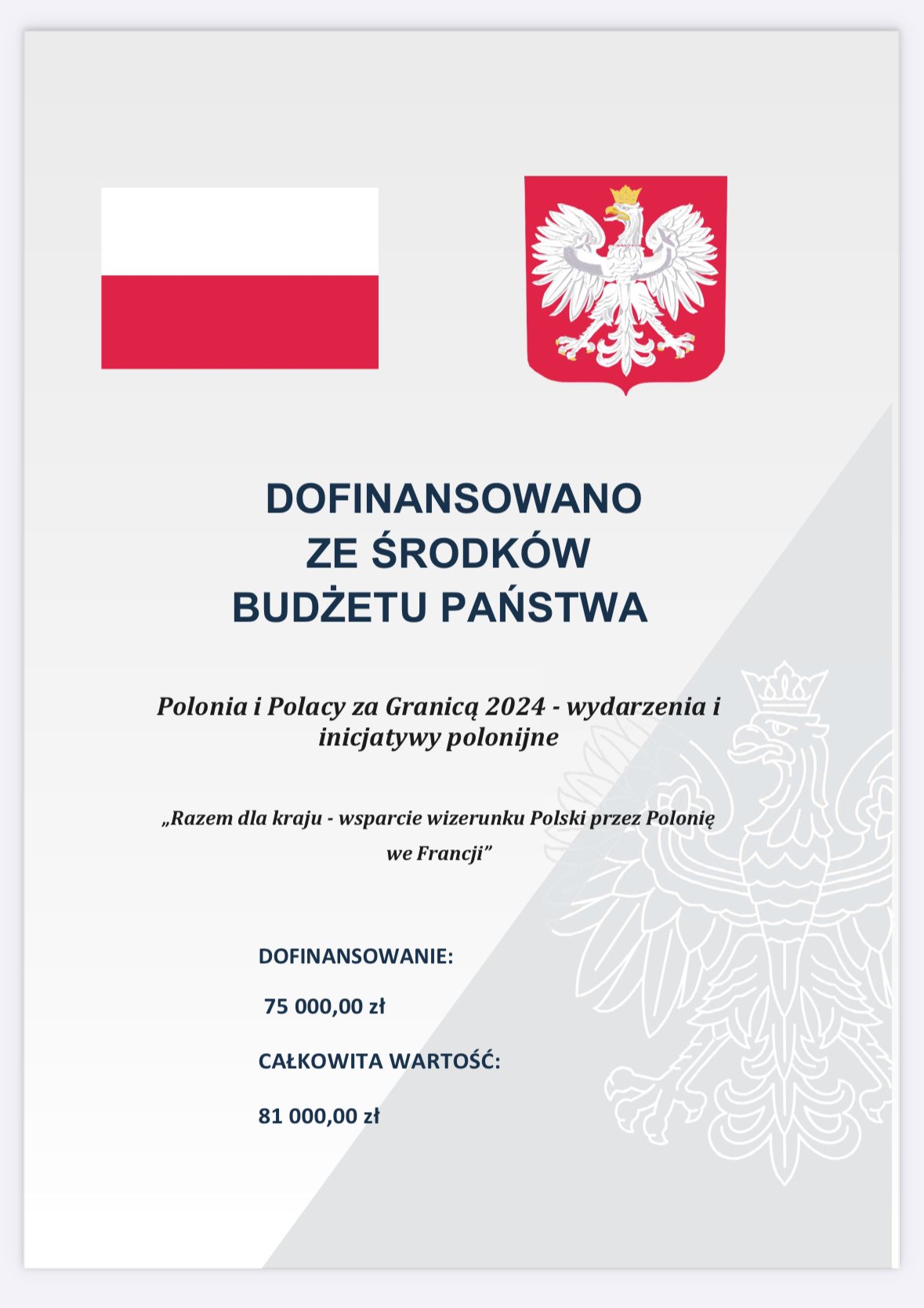 Celem projektu jest kontynuacja i rozwinięcie działań w zakresie budowania dobrego wizerunku Polski we Francji, realizowanych we współpracy z tamtejszą Polonią i Polakami.